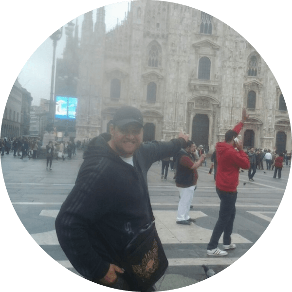 Pesquisador Luciano dos Santos, com a pastinha inseparável carregada de certidões viajo pela Itália em busca do local de origem dos antepassados italianos. Nesta imagem, foto em um dia frio de Milão.